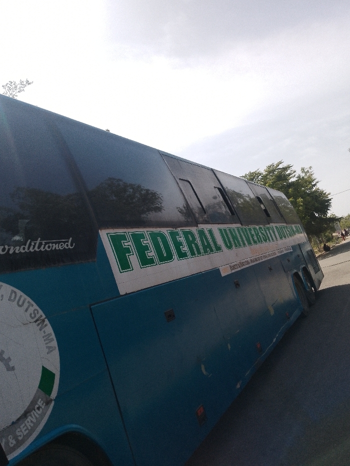 - "A teal blue coach bus, identified by prominent green lettering as "FEDERAL UNIVERSITY DUTSIN-MA" on its side and a partially visible circular crest displaying "SERVICE" and "DUTSIN-MA," is parked on a paved road in Dabawa, Nigeria" by FM-lXmRa2, licensed under CC BY 4.0