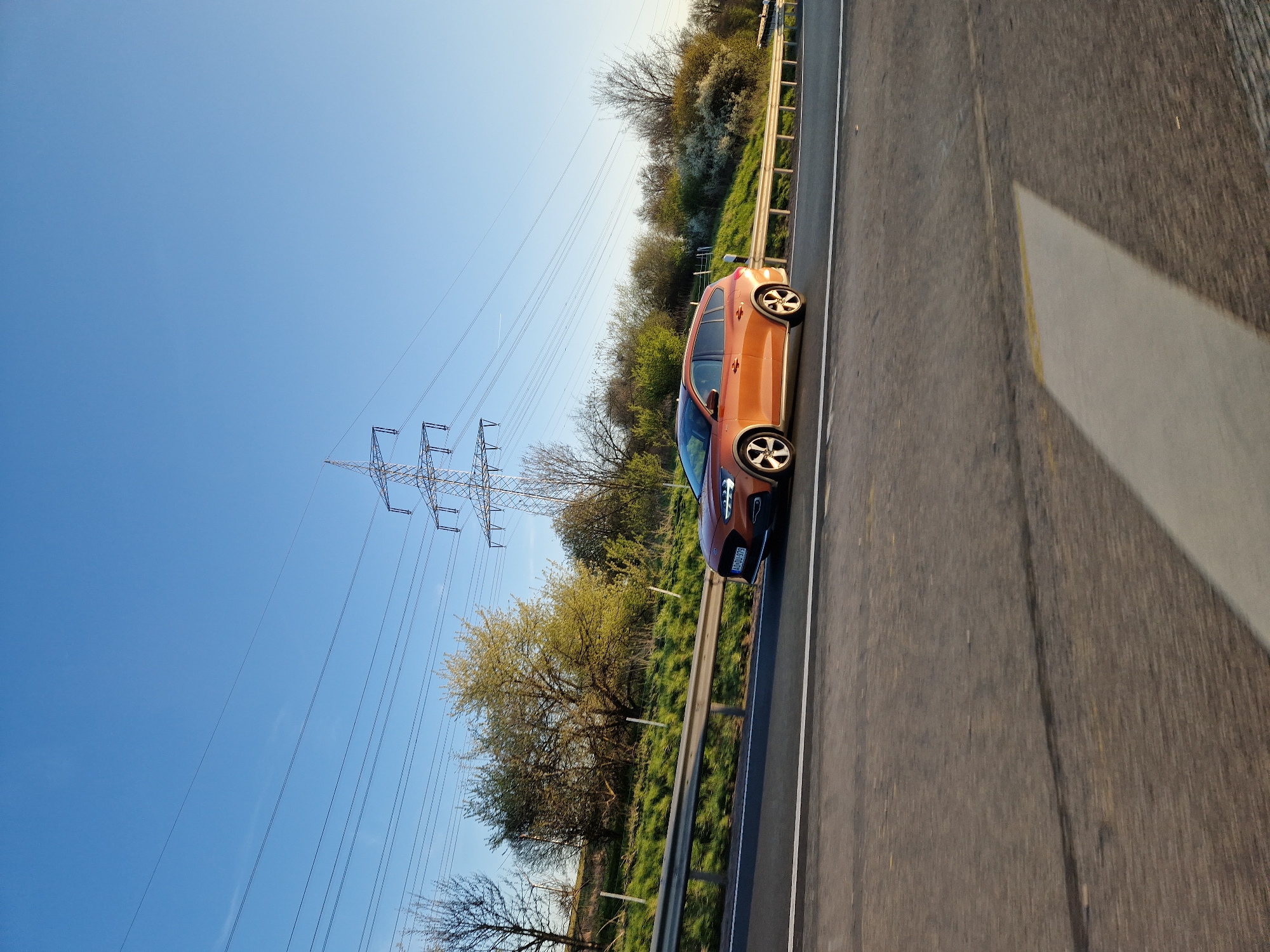 The image displays a highway scene under a clear, light blue sky, likely during late afternoon or early morning. An orange wagon-style vehicle, resembling a Ford Focus Active, occupies the rightmost lane of an asphalt highway, moving from left to right. Its front German license plate, `MZ-DU-975`, indicates registration in Mainz. The roadway features white lane markings. To the right of the highway, a metal guardrail separates the road from an elevated grassy embankment sparsely populated with deciduous trees and shrubs, some showing early spring foliage. In the background, a tall metal lattice electrical transmission tower (pylon) stands against the sky, supporting several overhead power lines that traverse the upper portion of the frame. The image appears to be captured from a moving vehicle.