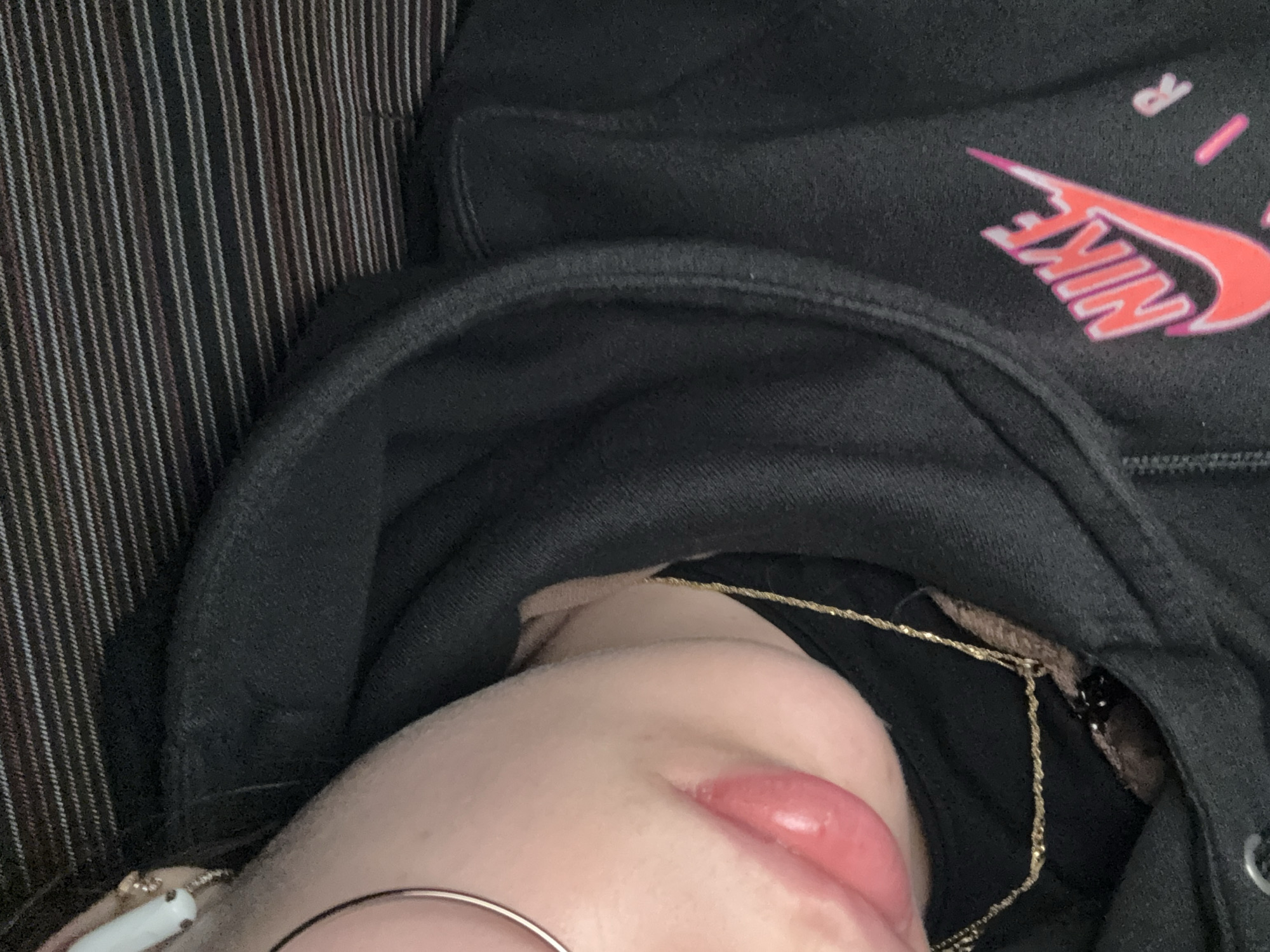 close-up of a person wearing a black Nike Air hoodie. The person is lying down on a surface with vertical stripes, possibly a couch or bedding. The person has a visible lip, part of a necklace, eyeglasses, and an earbud. The location is not discernible from the image. There is no indication of Herakovo, Bulgaria.