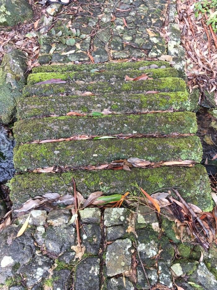 A moss-covered stone bridge spans a small stream, constructed from rectangular blocks