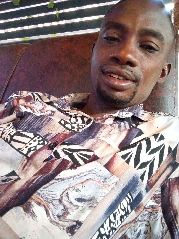 A close-up shot features a brown-skinned man with short hair and a goatee, gazing towards the camera. He is wearing a patterned shirt with brown, white, and black geometric designs. Behind him is a brown leather sofa and light coming through blinds. The photo is taken from a slightly low angle, offering a clear view of his face and attire.
