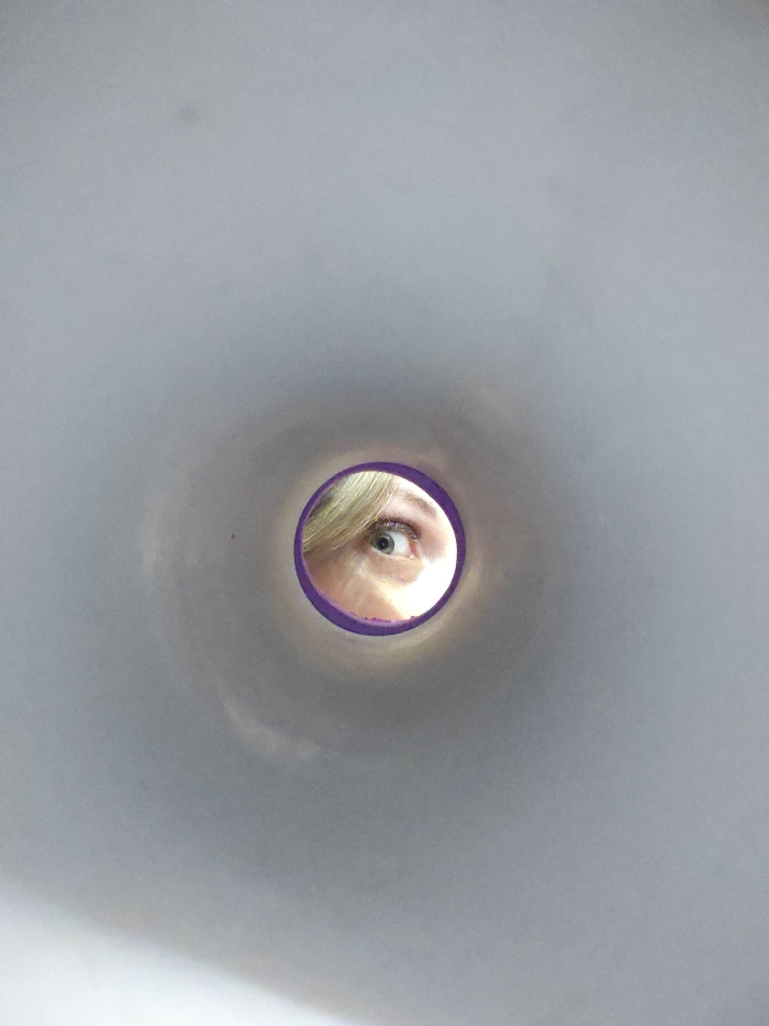 The image presents a forensic view of a single human eye and a section of a face, observed through a distinct circular aperture. The aperture, centrally located within a uniform, light gray surface, features a vibrant purple inner rim. The visible eye displays a light blue-green iris, with visible eyelashes, and is directed straight ahead. A portion of blonde hair is discernible above the eye. Bright illumination from the right highlights the facial features. The scene is located in the city of Chaikovsky, Russia.