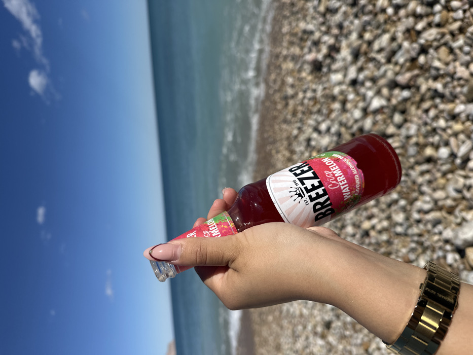 A close-up, eye-level photograph captures a human hand holding an open, clear glass bottle of Breezer Crisp Watermelon flavored alcoholic drink