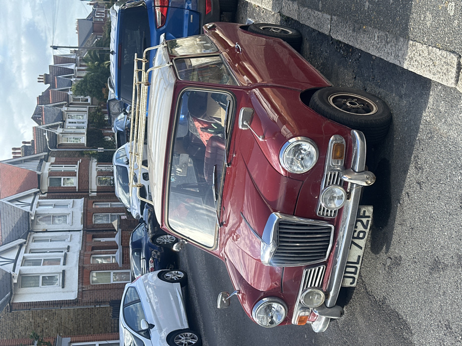 The image depicts a static street scene in Thanet, United Kingdom. In the mid-ground, a dark red vintage two-door car, license plate JDL 762F, is parked on the left side of an asphalt road, angled slightly towards the viewer. The vehicle features a cream-colored roof with a white roof rack, a chrome vertical grille, circular headlights, and two smaller auxiliary lights below the bumper. Its interior shows a red fabric item and two bottles on the front passenger seat. The road's edge is defined by a grey concrete curb on the right. In the background, a continuous row of multi-story terraced houses lines the street, characterized by brick ground levels, white upper facades, bay windows, and dark-tiled gable roofs. Other vehicles are parked along the street: a white hatchback is visible to the immediate left of the vintage car, followed by a dark blue sports car. A blue SUV is partially visible further down the street on the right. The sky is partly cloudy, and the scene is illuminated by daylight. No individuals, actions, or interactions are present.