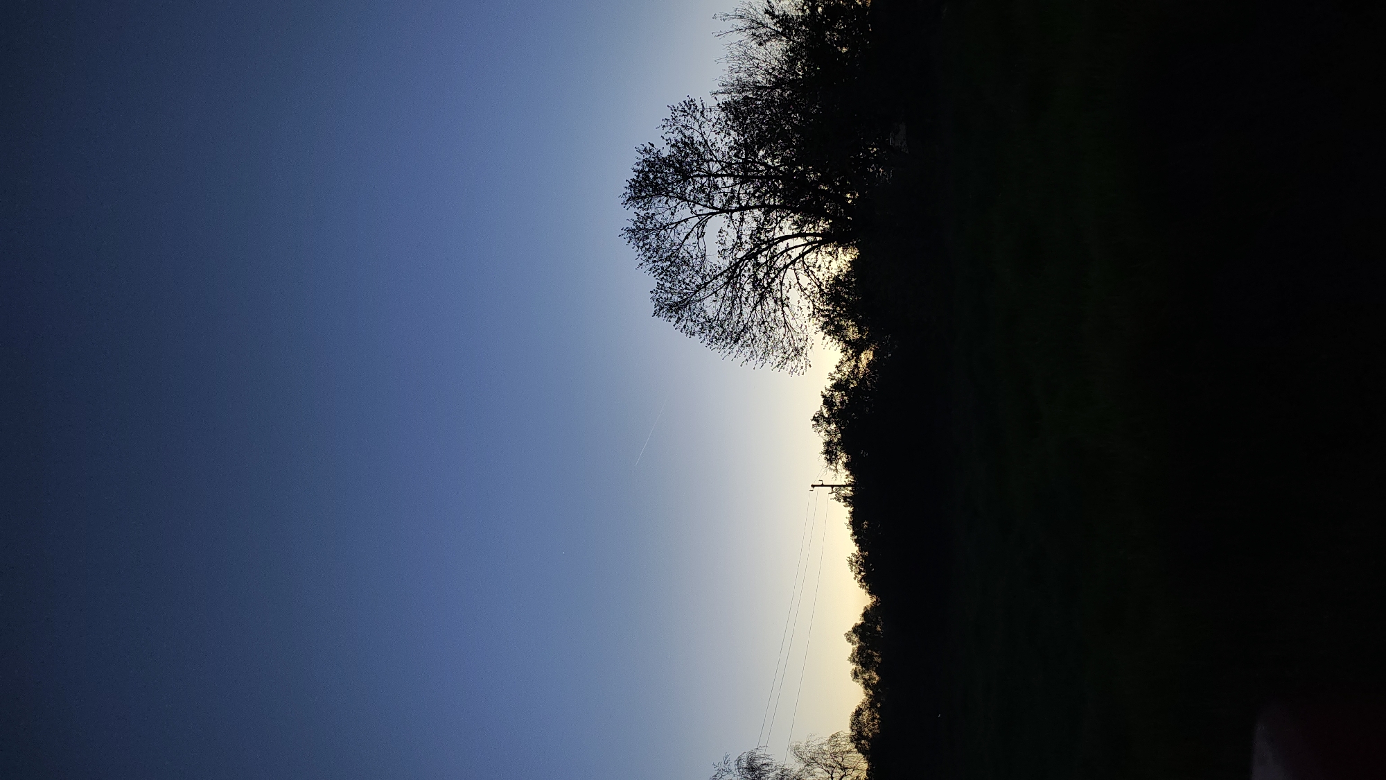 A landscape photograph taken in what appears to be dusk or twilight. The sky transitions from a dark blue at the top left to a lighter, yellowish hue near the horizon. A line of trees and bushes is silhouetted against the fading light, occupying the upper right of the image. A bare tree stands out against the sky to the left of the vegetation. A contrail can be seen on the sky. I am unable to provide the location information within the city of Negovan, Bulgaria, due to the image not containing sufficient information.