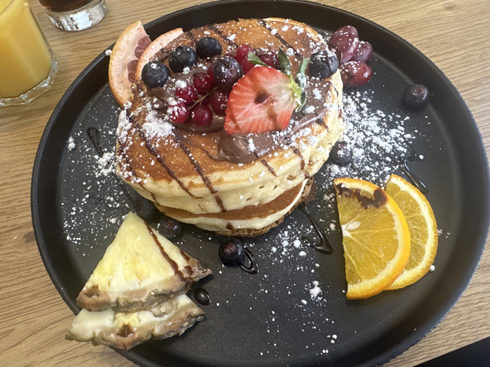 - "A close-up, high-angle shot depicts a stack of four pancakes served on a matte black circular plate" by FM-UArv82, licensed under CC BY 4.0
