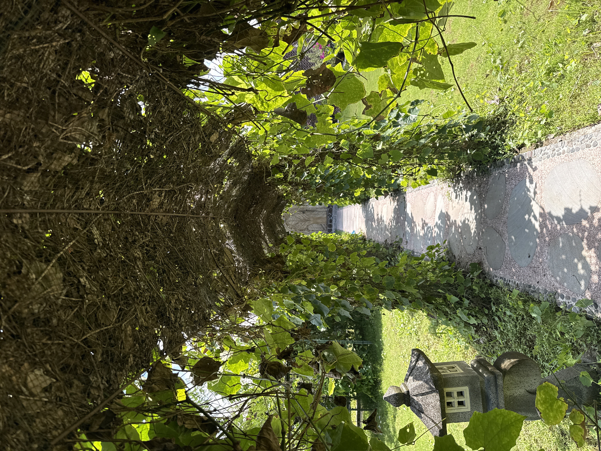 garden path in Blahbatuh, Indonesia. The path is lined with gray stepping stones bordered by gravel and grass. A tunnel-like structure covered in vines creates a canopy over the path. The vines are both green and brown, some in full leaf and others appearing dried. A stone lantern is visible on the right side of the frame. The lighting suggests it is daytime with shadows cast on the path.