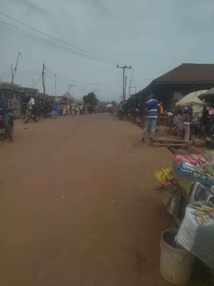 dirt road in Junction, Nigeria, located at coordinates 8.958 latitude and 7.551 longitude. Several people are walking down the street in the distance, including a man in a blue and white striped shirt. There are also several motorcycles parked on the side of the road. In the foreground, there is a small stand selling candy and other goods. The stand is situated on the edge of the road next to a white bucket. The day is overcast, with a gray sky and a light mist in the air. Power lines run over the road and through the scene. The scene is a rural village setting in Nigeria with unpaved roads and small shops along the sides.