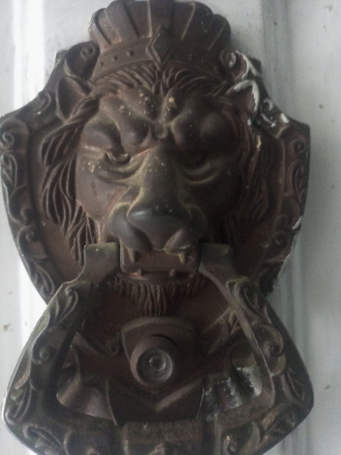 - "A dark, weathered metal door knocker, shaped as a crowned lion's head, is affixed to a light-colored, likely white, vertical door surface" by FM-9wV6D2, licensed under CC BY 4.0