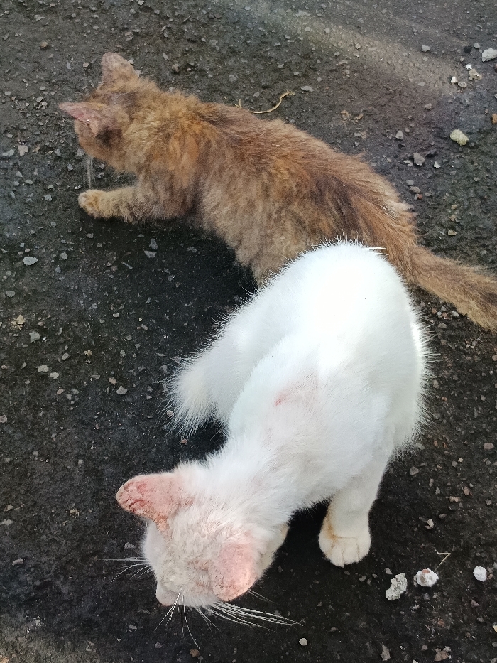 Two cats rest on a dark asphalt surface. One cat is a light brown color with a long tail and appears to be resting its head. The other cat is white with pink skin visible on its head and ears, indicating possible skin issues. The white cat is standing with its head lowered, sniffing the ground. Both cats seem to be in a state of rest or exploration.