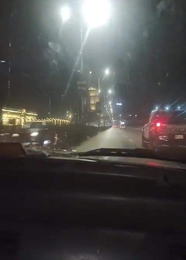 A person is driving a car at night on a brightly lit road. Other vehicles are visible on the road. The person is a young man with a beard. He is wearing a white shirt and a light brown sweater. The car's dashboard and windshield are visible, and the windshield appears dirty. The camera is located inside the car, likely in the back seat, and the footage is shaky.