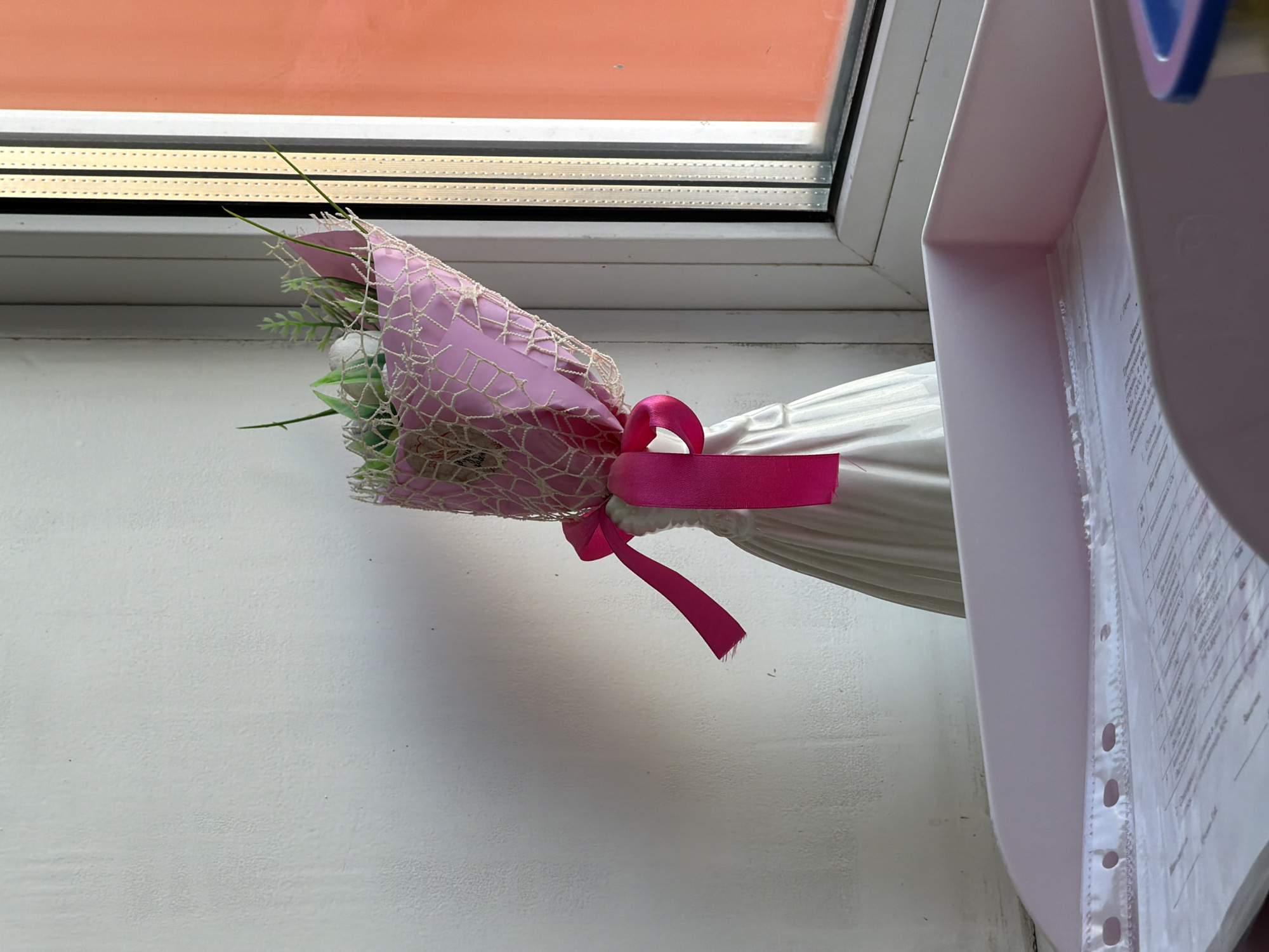A bouquet of flowers wrapped in pink paper and tied with a pink ribbon sits on a windowsill. The location appears to be inside a building in Perm, Russia. A folder with paperwork is visible to the right of the bouquet. The walls are painted white.