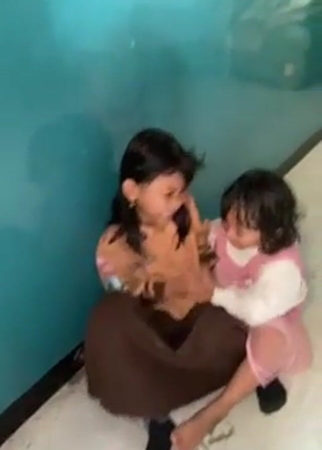Two young girls are sitting on a tile floor in front of a teal-colored wall. The older girl wears a tan-colored school uniform top, a long brown skirt, and black socks. The younger girl wears a pink dress with a white vest. The girls are holding hands and laughing. The older girl is smiling at the camera. The environment is a brightly lit corridor.