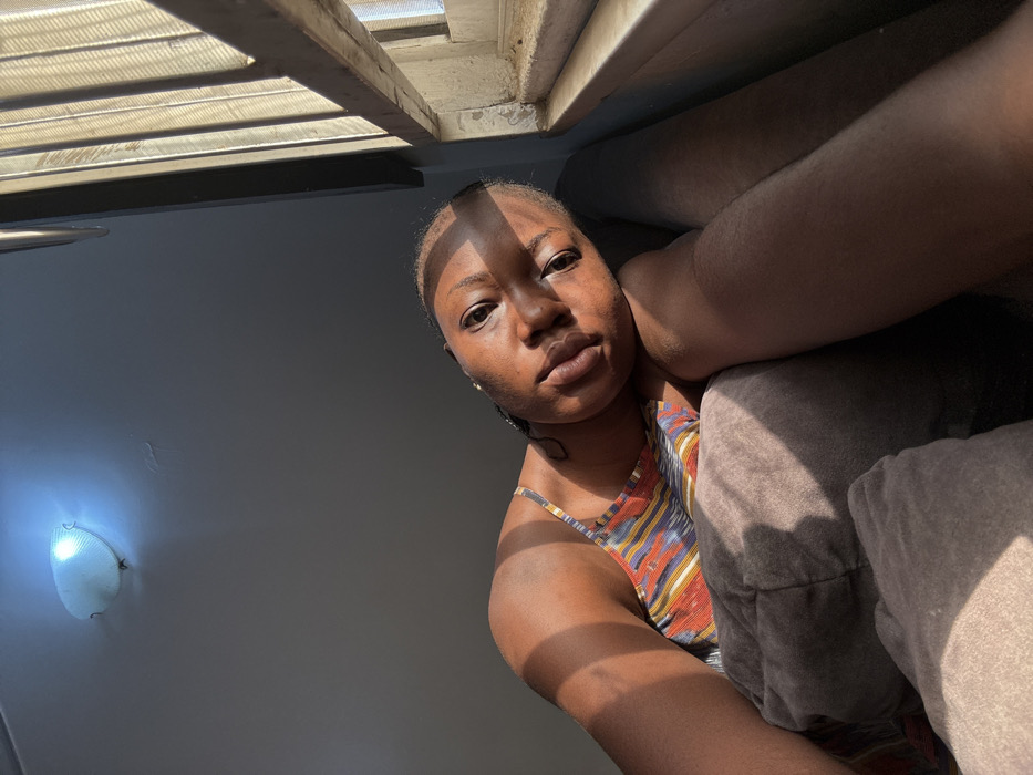 A low-angle selfie shows a young woman with light brown skin, wearing a patterned tank top and leaning on a tan cushion