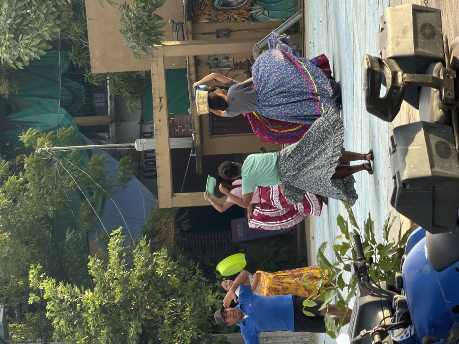 The image depicts an outdoor performance or cultural dance taking place in a public square or plaza in Mazunte, Mexico, during what appears to be late afternoon or early evening due to the warm lighting. Six individuals are visible, engaged in a dance. In the immediate foreground, a blue ATV is partially visible, with green foliage in front of it. Five women and one man are positioned across the mid-ground. The man, on the left, wears a blue polo shirt and dark shorts with a baseball cap, and has his arms outstretched, facing right. To his right, a woman in a yellow floral dress is partially obscured, and a bright green plastic bowl is suspended in the air beside her. To the right of the man, a woman with her back mostly to the camera wears a pink top and a maroon layered skirt with white trim, balancing a green plastic bowl on her head. Further right, another woman, also with her back mostly to the camera, wears a light green t-shirt and a floral green and blue skirt, which is flared out in motion. She appears to be wearing dark sandals or is barefoot. To her right, a woman in a grey t-shirt and a blue floral skirt with yellow, pink, and blue ribbons near the hem balances a woven basket on her head. Another individual is partially visible behind her, also in a colorful skirt. The ground surface is a light blueish-grey pavement. In the background, a series of buildings are visible. Directly behind the performers is a light brown/tan building with exposed brick sections and an arched entrance. A partial "Corona" sign is visible on a building facade further back and to the right. To the far right, a wall features a mural depicting a large animal eye, possibly a jaguar. A sign with the word "arce" is visible on a building to the left of the main tan building. Overhead, electrical wires crisscross, and a utility pole stands prominently. Lush green trees and foliage are present throughout the background and partially obscure some buildings, one of which has a balcony covered by a green tarp.