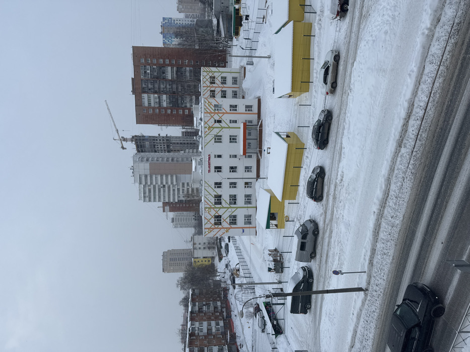 An elevated view of a snow-covered city street lined with parked cars and yellow-roofed buildings. The street runs diagonally across the frame. Various apartment buildings rise in the background, including one under construction with a visible crane. The sky is overcast, suggesting a cold winter day. Snow covers rooftops and the road surface, creating a stark contrast with the buildings and vehicles.