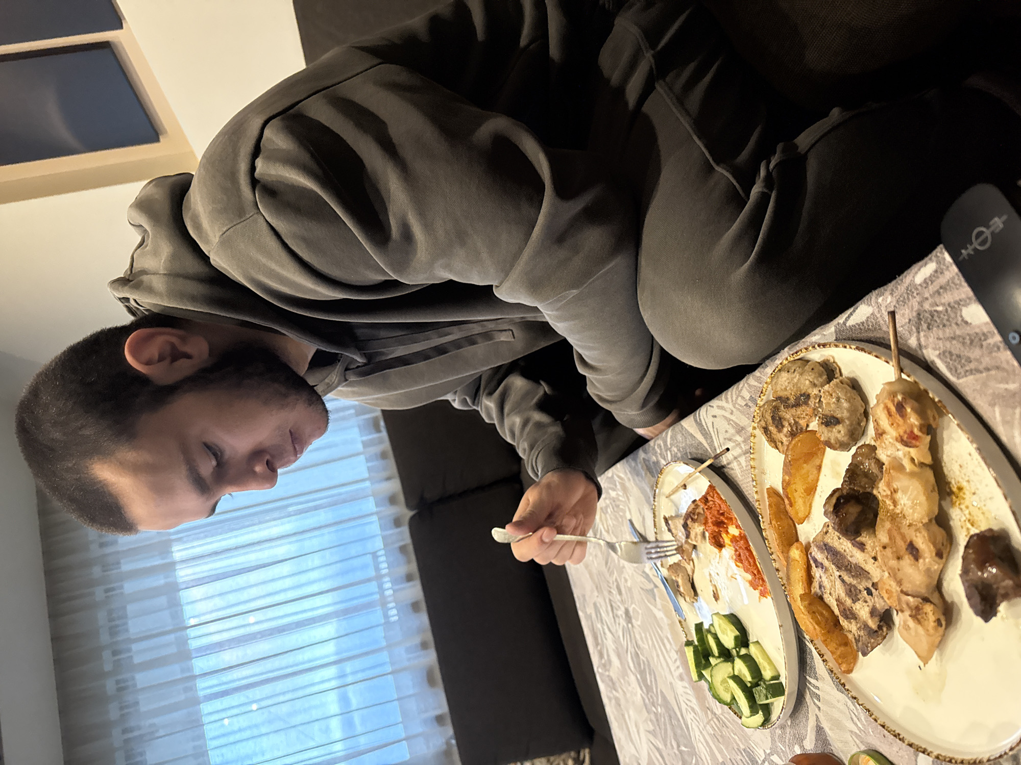 A man in a gray hoodie and sweatpants sits on a dark gray couch, eating food from two oval-shaped plates placed on a gray patterned table. The plate on the right contains grilled meat, meatballs, potatoes, and a skewer. The plate on the left has a red sauce and sliced cucumbers. He holds a fork in his right hand and is about to eat. The background shows white blinds in front of a window and a white wall. The location is unknown.