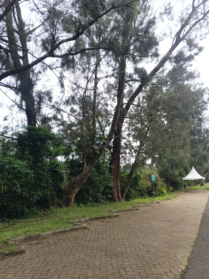 An outdoor scene in Kwekwe, Zimbabwe, displays a paved pathway running from the foreground into the mid-ground, bordered by natural vegetation under an overcast sky. The pathway is constructed from reddish-brown rectangular pavers, with a dark asphalt or paved edge visible on the far right. Concrete curbs separate the paver path from strips of green grass and a dense line of tall, slender trees, primarily exhibiting dark, rough bark and sparse, needle-like foliage, consistent with conifer or Casuarina species. Beneath these trees, particularly on the left, is an area of lush, dark green undergrowth and bushes. In the mid-ground, to the right of the dense foliage, a small, light blue rectangular sign mounted on a post is partially visible. Further in the background, on the right side of the image, a white conical tent structure with a peaked roof stands on a grassy patch. No individuals or animals are present.