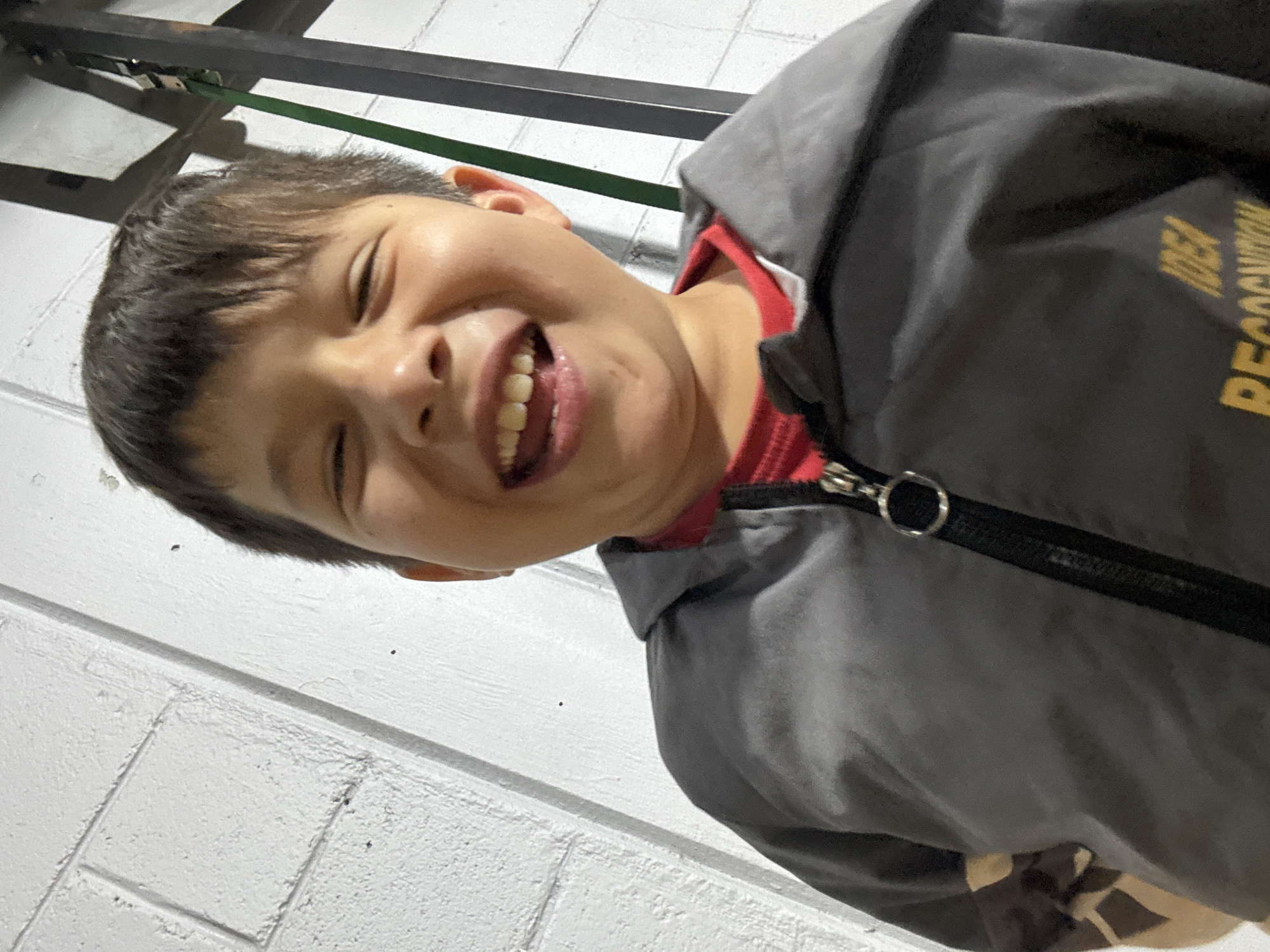 A young child, approximately 6-10 years old, with dark hair and a light complexion, is depicted in a close-up, upward-angled shot. The child is laughing, indicated by an open mouth revealing teeth and closed eyes. The child wears a grey zippered jacket over a red garment. The jacket features a black zipper with a silver circular pull tab, and partially visible yellow text spelling "IDEA RECOGNITION" is present on the lower right front. The jacket's left sleeve (viewer's left) has a brown and tan camouflage or patterned design. The background on the left consists of a white concrete block wall. On the right, a dark metallic structural element is visible, with a vertical dark green strap hanging beside it. The scene is set indoors in Oaxaca City, Mexico.