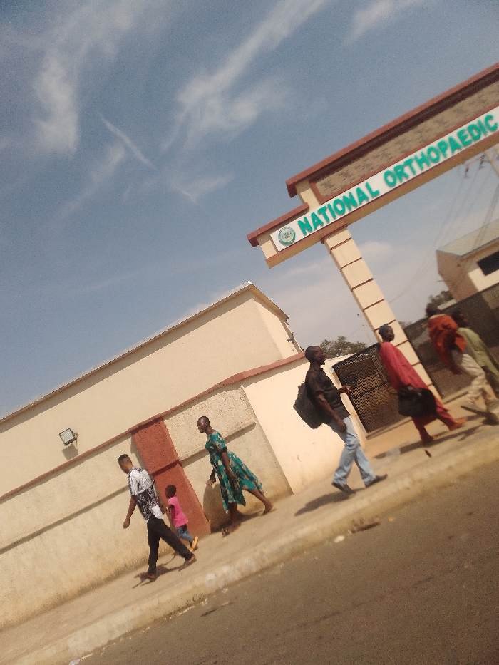 The image presents an outdoor street scene in Jos, Nigeria, specifically depicting the immediate vicinity of the National Orthopaedic Hospital