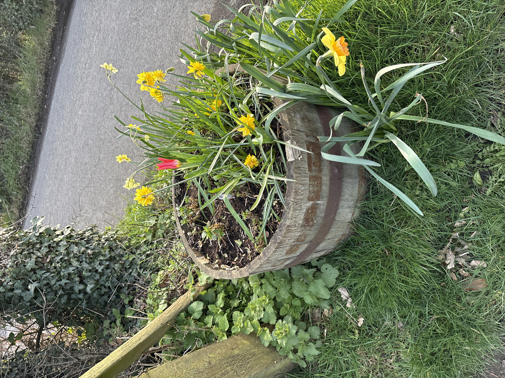 The scene depicts a static outdoor environment in Snailbeach, United Kingdom, on what appears to be a sunny day. The primary subject is a weathered, light-brown wooden barrel planter, approximately half-height, secured by two rusty metal bands. It contains dark soil from which numerous yellow daffodils (Narcissus) are growing, many in full bloom, alongside one prominent red tulip and various green foliage, including some with white variegation. The barrel is positioned on a grassy verge adjacent to a grey asphalt road, which occupies the midground and background on the right side of the image. The grass directly surrounding the barrel is green, with some scattered dry leaves. To the immediate left of the barrel, a dense patch of green stinging nettles (Urtica dioica) is visible. Further left and behind the nettles, a thick, dark green ivy (Hedera helix) heavily covers a tree trunk or large bush. A light-colored, weathered wooden post or stake is partially visible on the far left, leaning slightly. No people, animals, or vehicles are present. The lighting suggests direct sunlight, casting subtle shadows and highlighting the vibrant colors of the flowers and foliage.