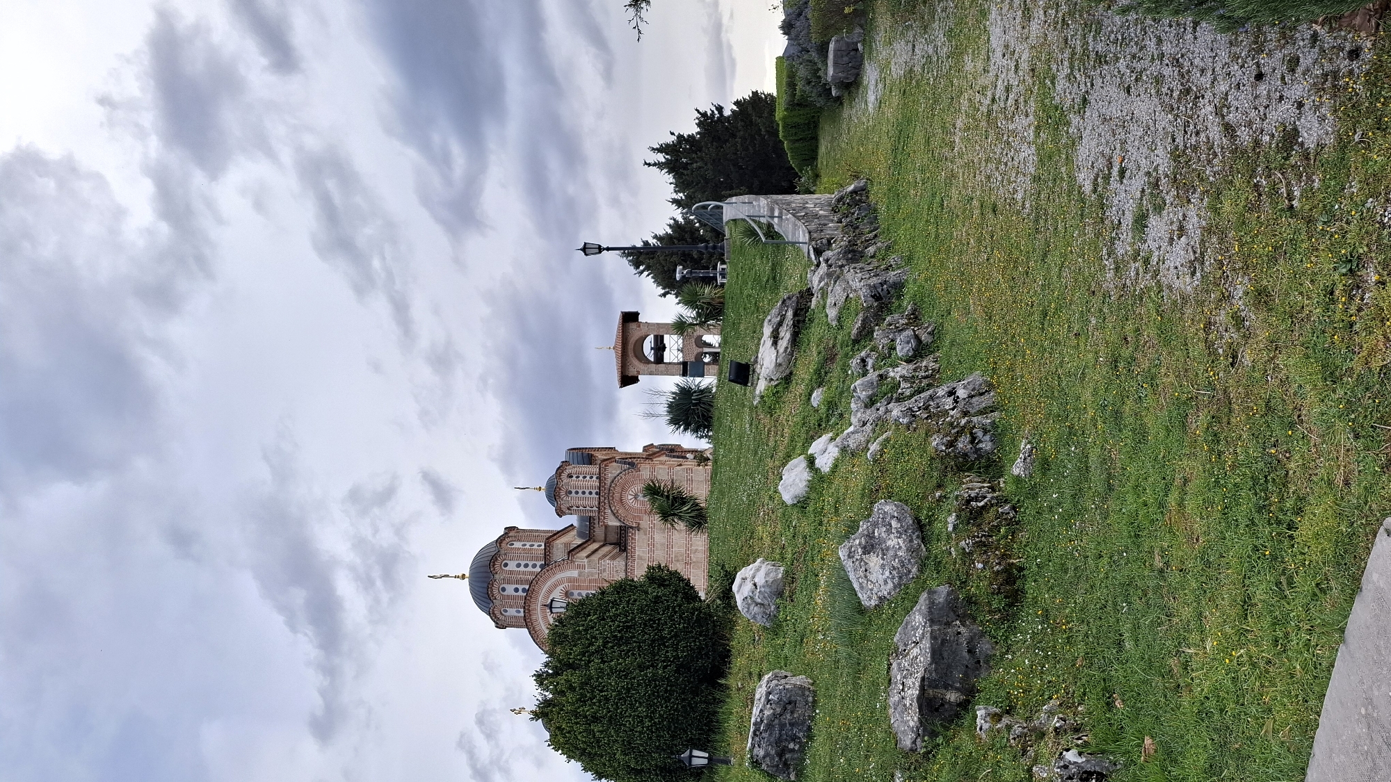 The image displays the Hercegovacka Gracanica monastery, located on a hill overlooking the city of Trebinje, Bosnia and Herzegovina. The monastery structure, constructed primarily of reddish-brown brick with lighter mortar lines, features multiple dark-domed roofs, each topped with a golden cross. The central dome is larger than the surrounding smaller domes. The building is situated on a steep, grassy incline, which is dotted with numerous grey boulders of varying sizes and patches of small yellow and white wildflowers. A large, rounded evergreen bush obscures a portion of the monastery on the left. In the midground, a curving gravel path ascends the right side of the hill, bordered on its left by the grassy slope and on its right by a low stone wall topped with a dark metal railing. To the right of the main monastery building, a separate, open-frame bell tower with a single bell is visible, constructed of similar brick and topped with a dark roof. A tall, black ornamental lamppost stands near the bell tower, and another smaller lamppost is positioned in the foreground near the large evergreen bush. Several dark evergreen trees are visible behind the bell tower. The sky above is heavily overcast with dense, grey clouds. No individuals are present in the scene, and no specific actions or interactions are depicted.