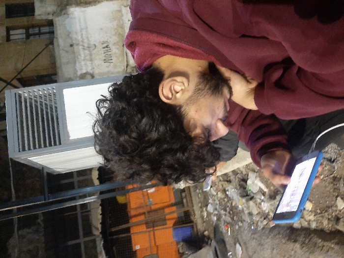 A person wearing a burgundy hoodie sits outdoors, engrossed in their phone. The phone has a blue case and displays a bright screen. The individual has curly dark hair and a beard. They appear to be resting their head on one hand. The background includes what appears to be an air conditioning unit and assorted debris on the ground. A building is visible behind the unit, with what looks like trash scattered around.