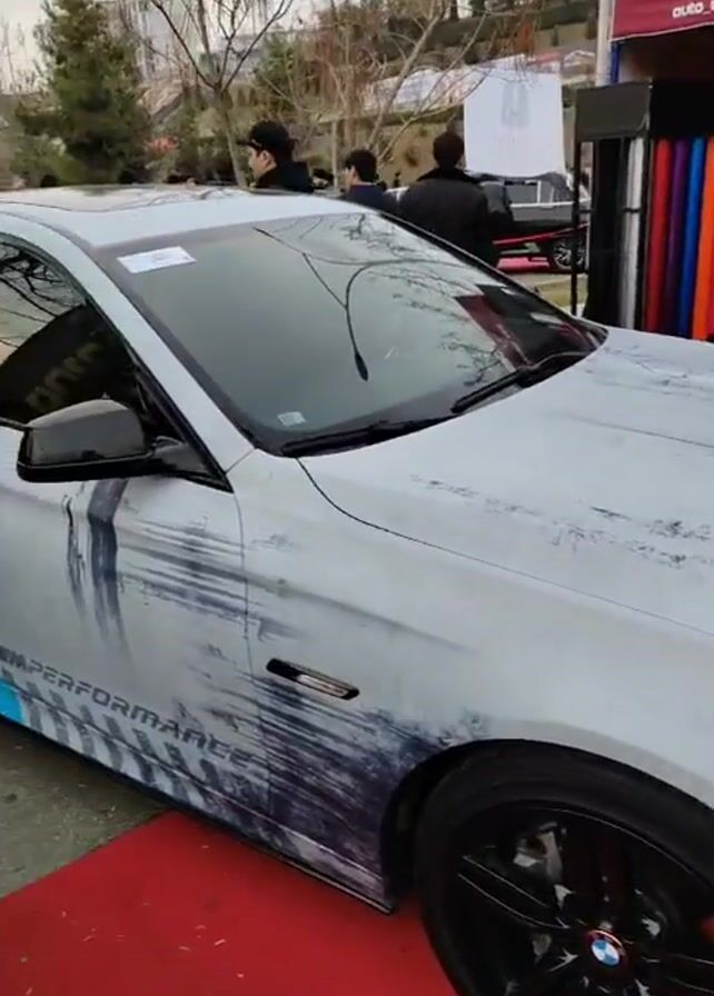 uniquely painted BMW sedan on display at an outdoor event