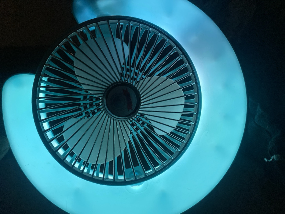 - "A top-down, close-up shot reveals a small, round fan with a silver grille and white blades, centered on a blue, illuminated swirl" by FM-AjSvv2, licensed under CC BY 4.0