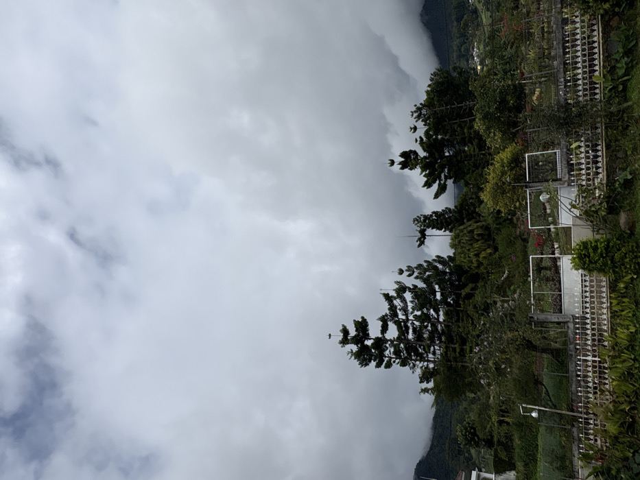 Overcast skies dominate the image. A mountain ridge is partially obscured by fog. The foreground features lush greenery, including various trees, shrubs, and a landscaped garden. A white fence with intricate metalwork runs along the edge, adding a formal touch to the natural scenery. The image evokes a sense of tranquility despite the gloomy weather.