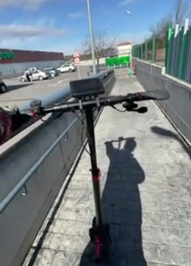 person riding an electric scooter along a paved path on a sunny day. The scooter is black with red accents and has a small screen mounted on the handlebars. The person is wearing gloves. The path is bordered by a gray concrete wall on one side and a parking lot on the other. In the background, a Mercadona supermarket is visible. The sky is blue with scattered clouds. The camera is mounted on the scooter, providing a first-person perspective of the ride.