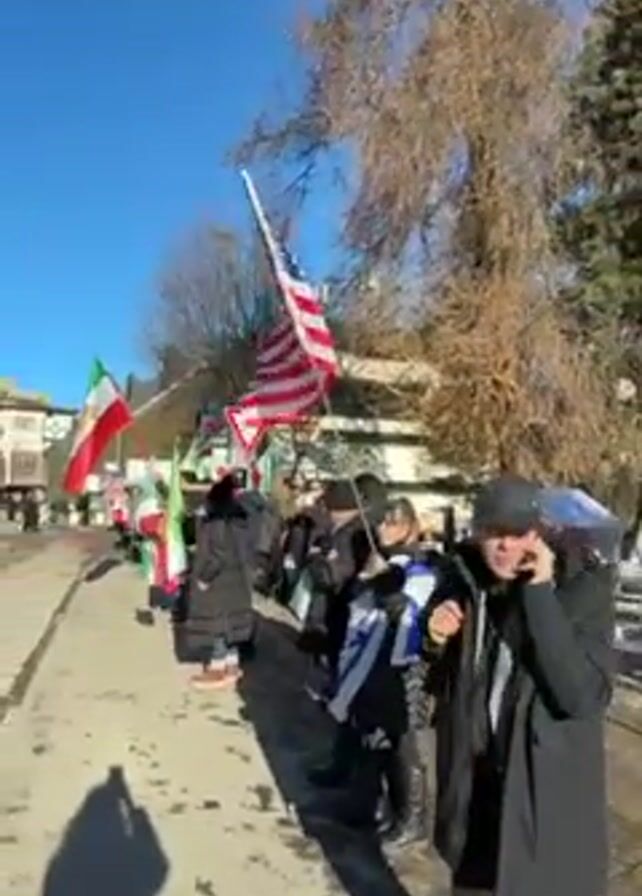 small group of people standing on a street, some holding flags, including the American, Iranian, Italian, and Israeli flags. The crowd is diverse in terms of clothing and appearance. Some people are wearing warm coats and hats, indicating a potentially cold climate. One individual in the foreground is on a cell phone. A traffic sign is visible in the background, along with bare trees and buildings. The sky is clear and blue. The video appears to capture a demonstration or gathering of people expressing their views, with flags as a symbol of their affiliations.