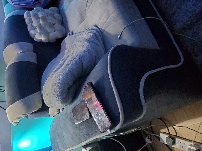 A close-up, angled shot shows a section of a blue and gray couch. A gray blanket is draped over the couch, and a white, knotted pillow rests nearby. Two smartphones are lying on the couch's armrest, partially overlapping. An iPhone charging cable is seen. In the background, a multi-outlet power strip sits on a wooden floor. The scene is lit with a soft, diffused light, with a blue glow reflecting off the wall behind the couch.
