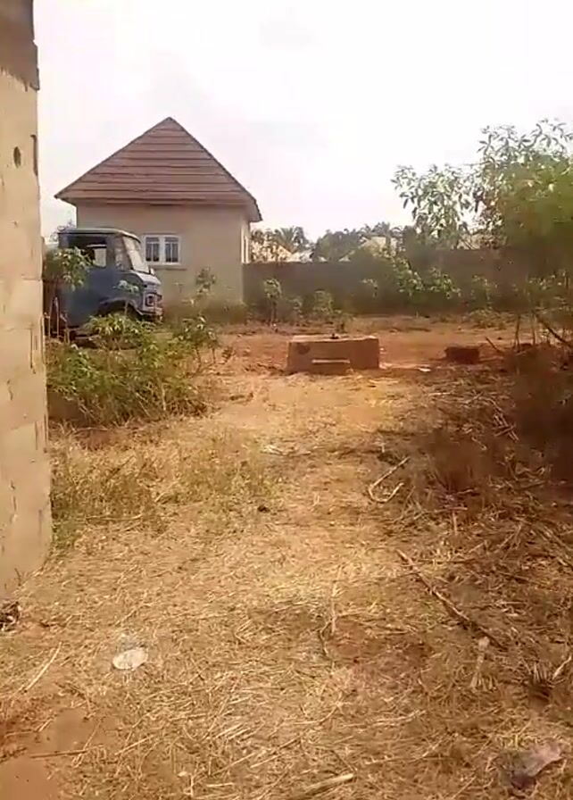 The camera moves slowly to the right, revealing a dry, grassy yard with a brick building to the left and a house in the background