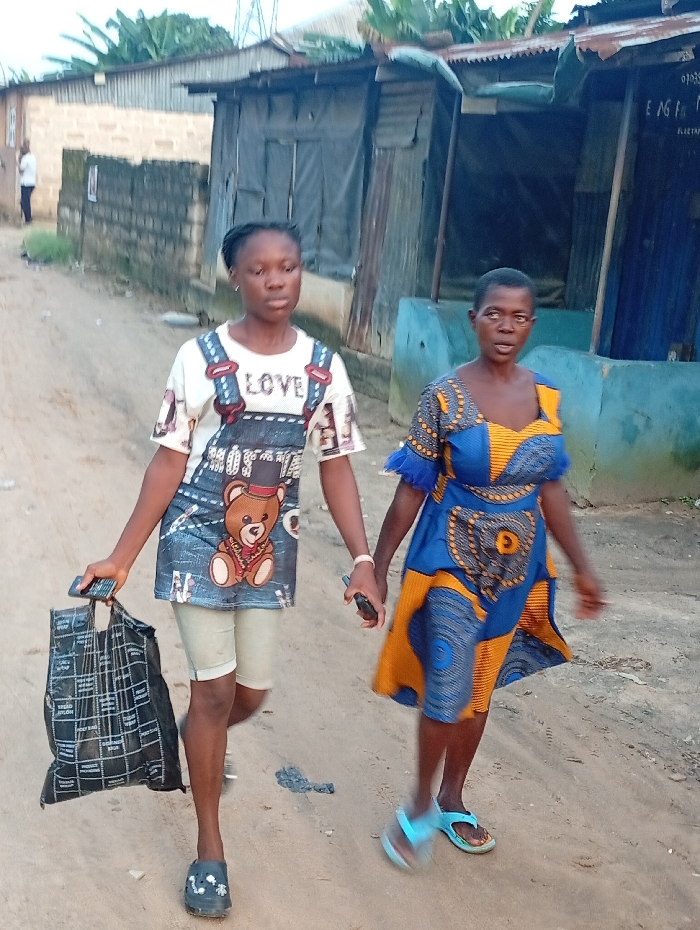 The image captures two women walking on an unpaved dirt road in Aba, Nigeria
