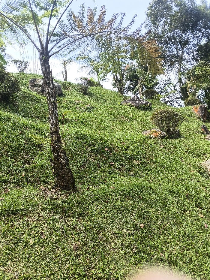 A grassy slope fills the frame, dotted with rocks and small bushes. A slender tree with fern-like leaves stands prominently on the left. Other trees populate the hilltop in the background, creating a textured green scene. The sky is visible through the trees, appearing bright. The light in the bottom right corner is overexposed.