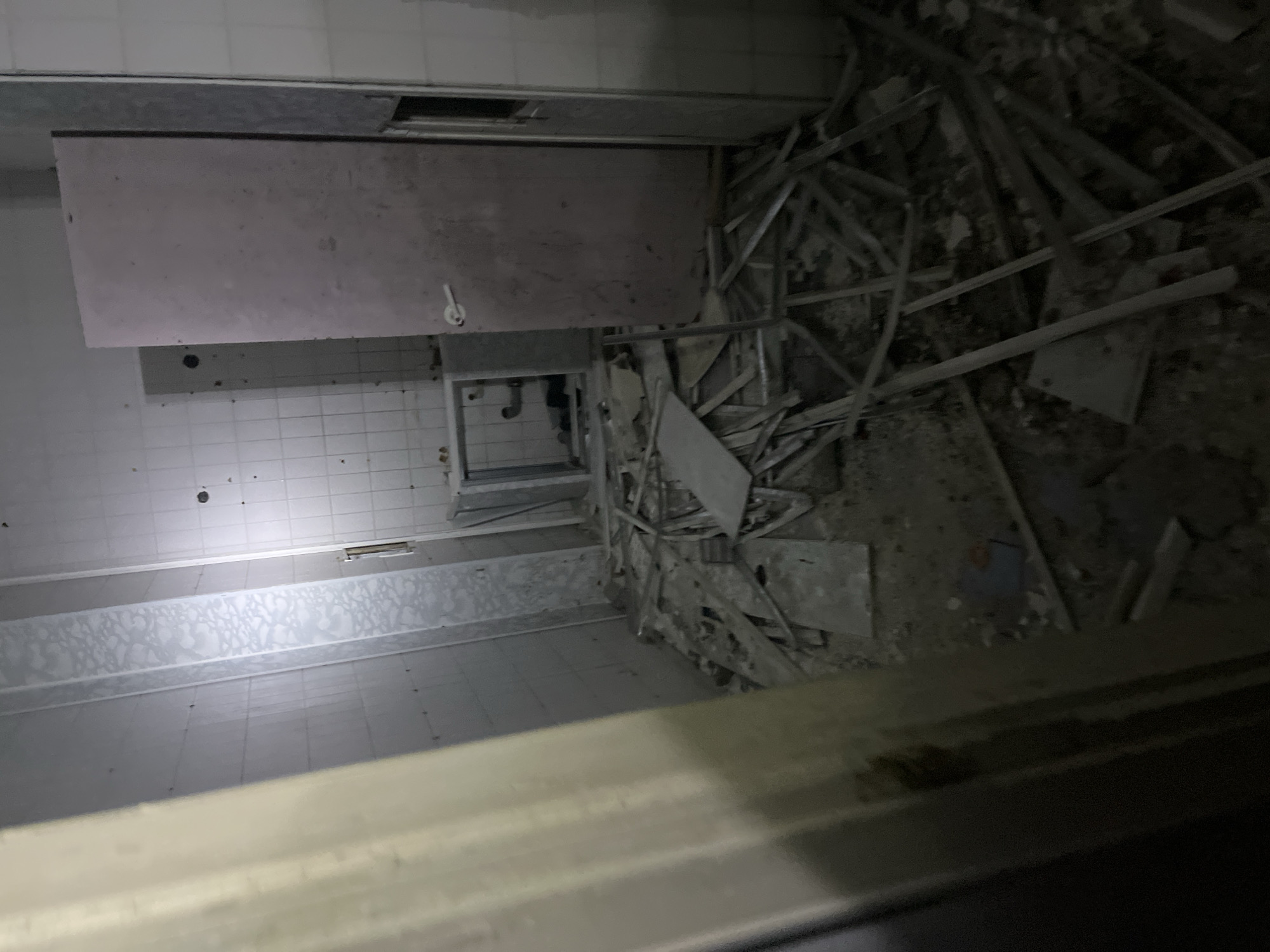 n interior view of what appears to be a dilapidated bathroom or similar tiled room