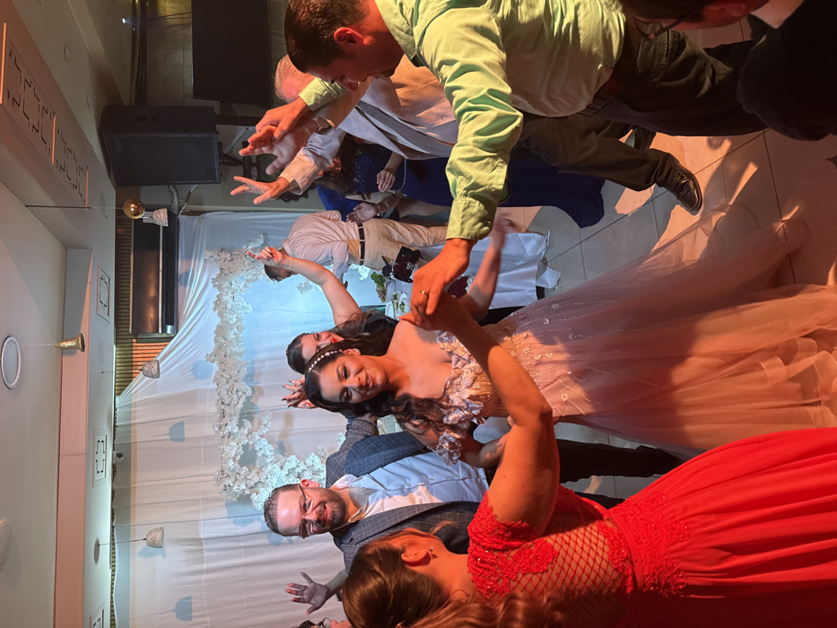 A rotated indoor shot captures a wedding reception scene. The bride, in an ornate gown, smiles amidst dancing guests. Men in casual dress shirts and a woman in a red dress with lace details surround her. Overhead, a white backdrop adorned with floral arrangements hangs behind the group. Speakers and wall-mounted light fixtures are visible in the background, suggesting a venue designed for events.