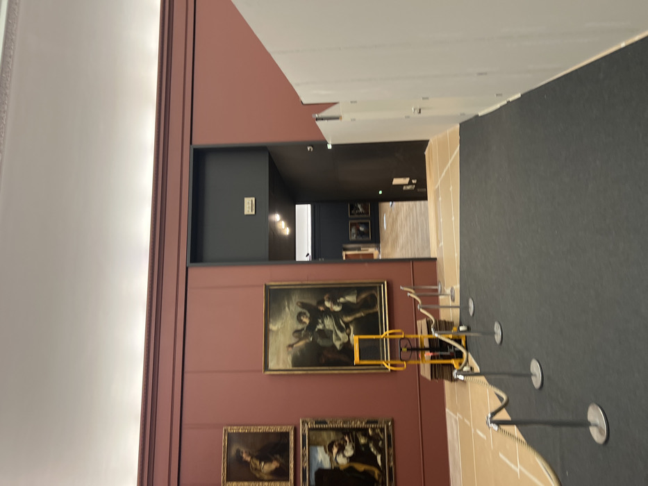 This image depicts a gallery within the Louvre Museum in Paris, France, specifically a section displaying European paintings. The scene shows a spacious room with deep reddish-brown walls adorned with decorative moldings near the ceiling. On the left wall, three framed oil paintings are vertically arranged. The most prominent is a large, central Baroque-style artwork featuring multiple figures, one depicted with arms dramatically raised skyward against a dark, stormy background. A smaller painting is visible directly above this one, and another below it, both also framed. In the foreground, a dark grey carpet covers the floor. A series of five silver stanchions with braided ropes extends from left to right, creating a barrier or designated pathway. Resting on a stack of flat, possibly cardboard, materials near the base of the large central painting is a bright yellow hand truck or trolley. The floor beneath the carpet in the immediate foreground shows visible white taping outlining sections on a lighter surface. To the right, a temporary, plain white partition wall is erected, extending into the frame and partially obscuring the view. In the background, a wide, dark grey archway provides a clear view into an adjacent gallery. This further room features darker walls, a parquet floor, and additional framed paintings visible on the far wall. Overhead lighting fixtures illuminate this connected space. A small rectangular sign, likely an informational or directional sign, is affixed to the wall above the archway. No people are visible in the scene. The presence of the hand truck, stanchions, and temporary partition suggests ongoing setup, maintenance, or restricted access within the museum.