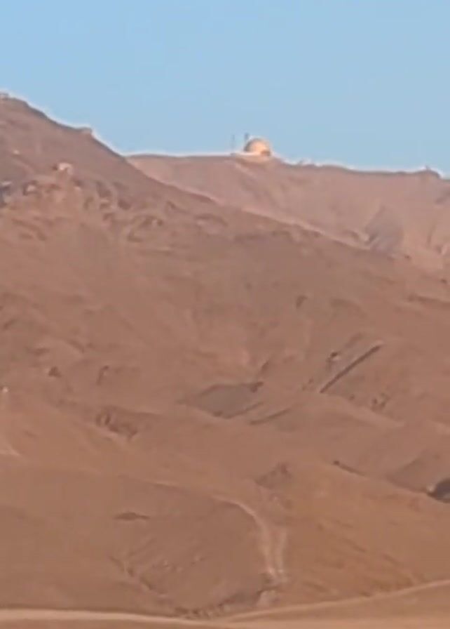 desert landscape under a clear blue sky. In the first shot, a brown, barren mountain stands prominently, with a small, golden structure visible on its peak. The scene then shifts to a view from inside a moving vehicle, showing the landscape passing by. The road appears unpaved. The side mirror of the vehicle is visible. The landscape consists of a flat, sandy terrain with distant, rolling brown hills. The overall impression is a vast, arid environment under bright sunlight.