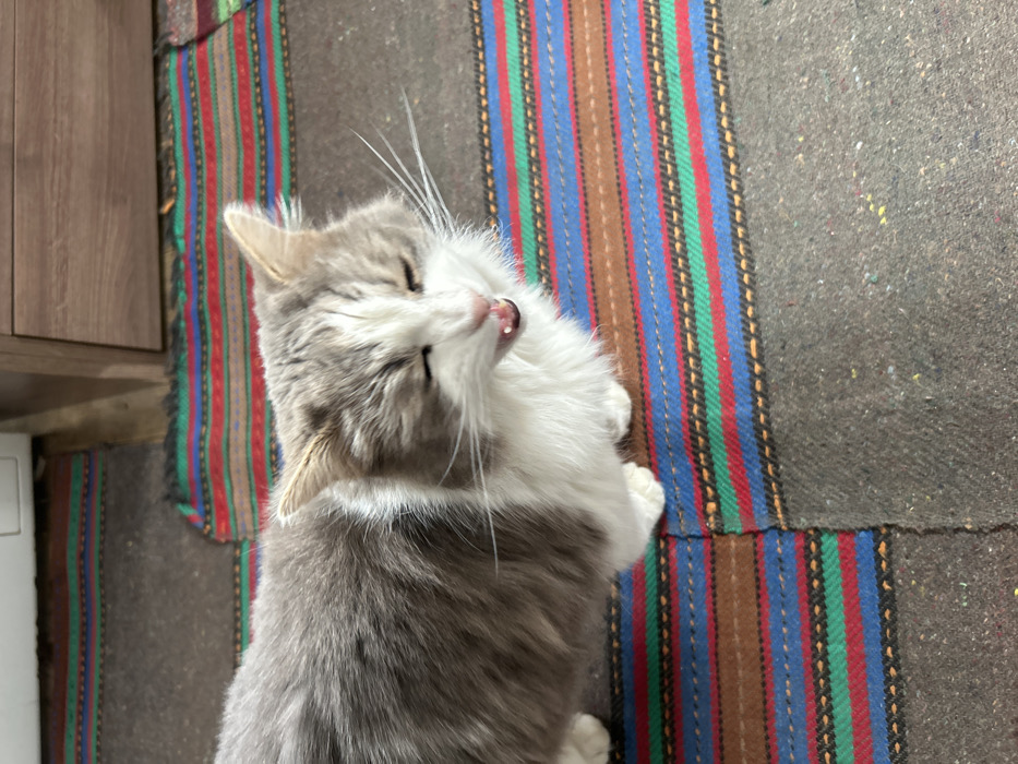 An image taken in Stargel, Bulgaria, depicts a medium-haired domestic cat on a patterned rug indoors. The cat is predominantly white on its chest and paws, with a mottled grey and white coat on its back and head. Its eyes are tightly closed, and its mouth is open, exposing a pink interior and small teeth, suggesting an action such as a sneeze, yawn, or vocalization. Long white whiskers extend from its muzzle. The cat stands on a floor covered by a rug composed of two distinct sections: one is a dark, textured grey, and the other features horizontal stripes in red, green, blue, and brown. These two sections appear to be joined together. In the blurred background, a light-colored baseboard or appliance and a dark wooden furniture item are visible.