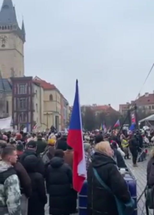 crowd of people gathered in a town square. Many are holding Czech flags, with the Old Town Hall visible in the background. A stage setup is present with speakers and a screen. The sky is overcast. The people appear to be part of a demonstration or gathering.