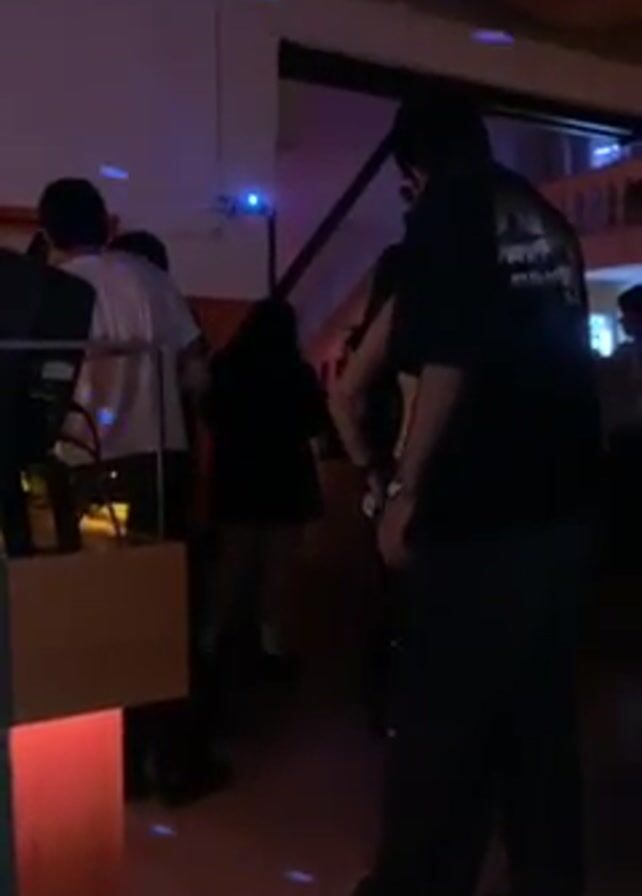 dimly lit indoor scene, possibly a bar or club, with several people present. There's a man in the foreground wearing a black t-shirt, dark pants, and shoes. Several other people are visible in the background, some standing near a lit countertop or bar area. One person is wearing a white shirt. Blue lighting and disco lights are apparent. The video's perspective seems to be from behind or to the side of a doorway. The background contains details like hanging decor and what appears to be a partial view of another level.