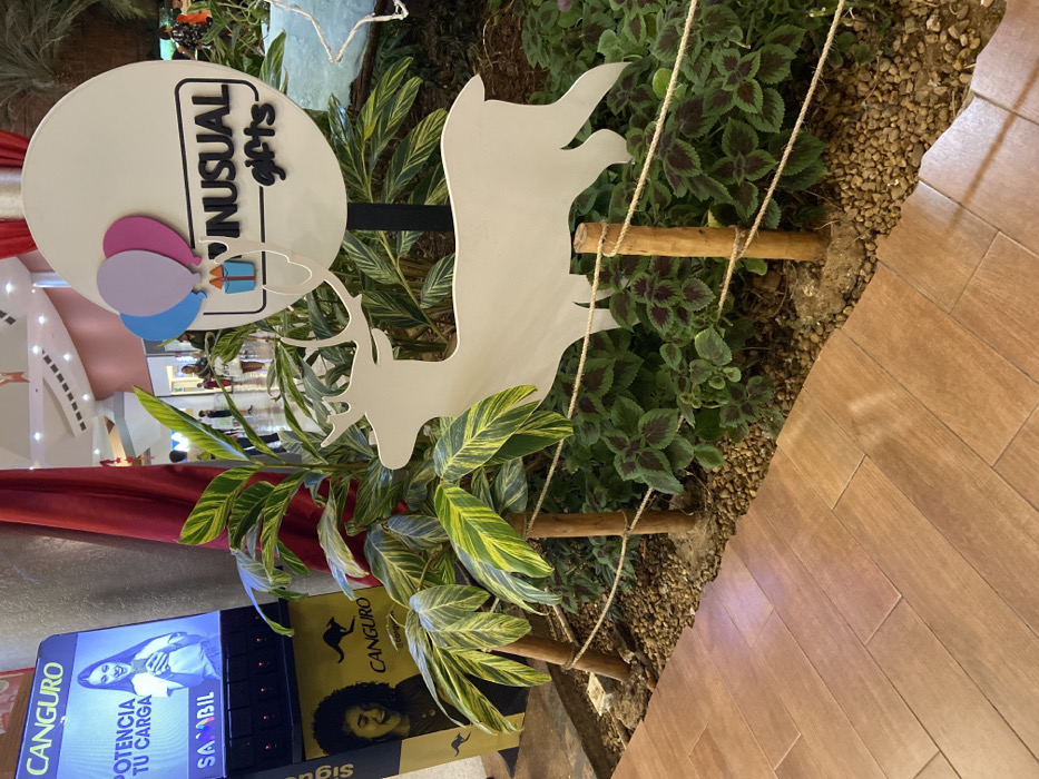A festive indoor decoration features a white reindeer cutout and a round sign reading "Unusual Gifts," adorned with balloon and gift box icons. The display is surrounded by lush green plants and supported by wooden poles strung with twine. A "Canguro" branded sign is visible nearby. The scene takes place indoors with a wooden floor and a retail setting visible in the background.