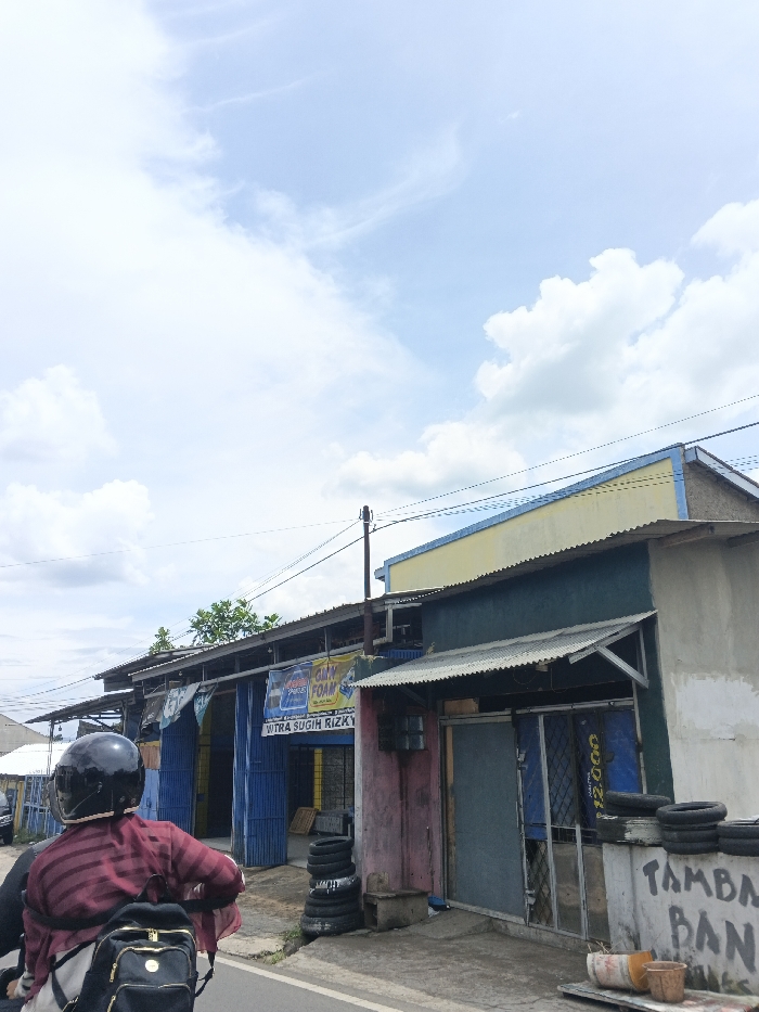 A street-level shot shows buildings with corrugated metal roofs under a partly cloudy sky. A sign reading "SAEN OLIM FOAM" and "MITRA SUGIH RIZKY" is visible on one building. Tires are stacked near the entrance of a building with peeling paint. A person wearing a helmet and backpack sits on a motorcycle in the foreground, suggesting movement along the road.