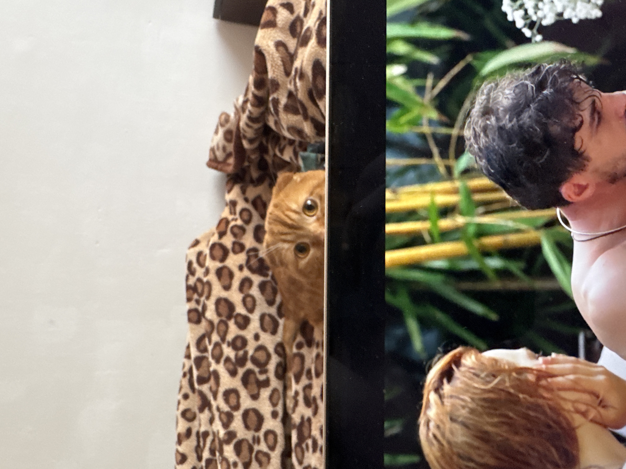 The image depicts an indoor scene in the city of Sofia, Bulgaria. In the upper half, a light-colored wall forms the background behind a draped leopard-print blanket. An orange feline (cat) is partially visible, peeking over a black horizontal surface, with its head and wide eyes fixated forward. The lower half of the image displays content from a screen, likely a television. On the left side of the screen content, the back of a female individual's head and shoulder are visible; she has reddish-brown hair, and her right hand is positioned near her ear/face. On the right, a male individual's bare shoulder and the side of his head are visible; he has dark, curly hair and a beard, and wears a thin necklace. The background visible on the screen consists of green foliage and yellow bamboo stalks, with white flowers on the far right. The cat appears to be observing the content displayed on the screen.