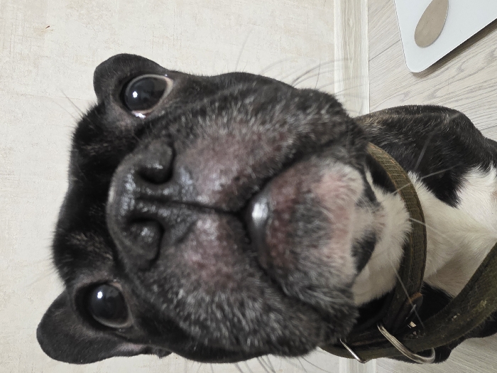 - "A black and white French Bulldog is depicted in a close-up, low-angle shot, looking directly upwards" by FM-90THh1, licensed under CC BY 4.0