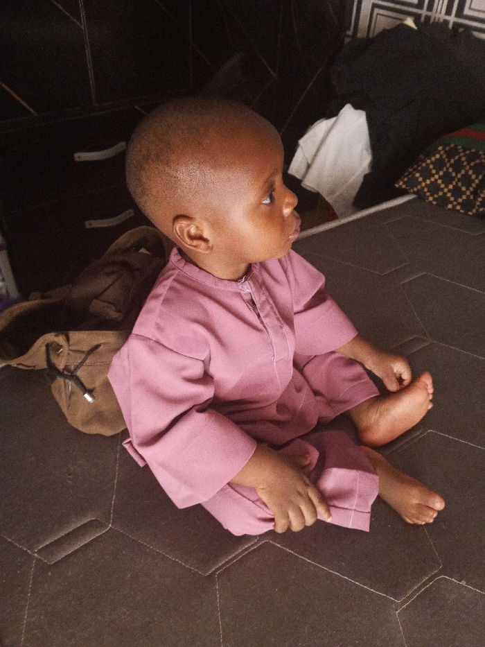 An infant or toddler, identified as a young child with dark skin and a closely cropped or shaved head, is seated upright on a dark gray surface exhibiting a repeating hexagonal pattern
