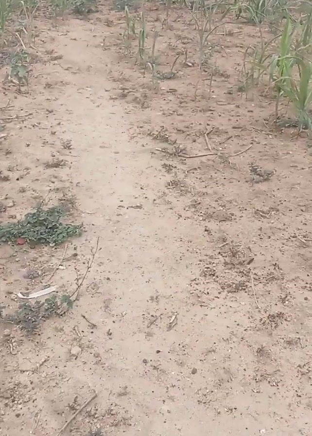 The camera pans across a patch of dry, sandy soil. Some green stalks of plants are visible along the left edge of the frame. There are scattered small stones and dried twigs on the ground.