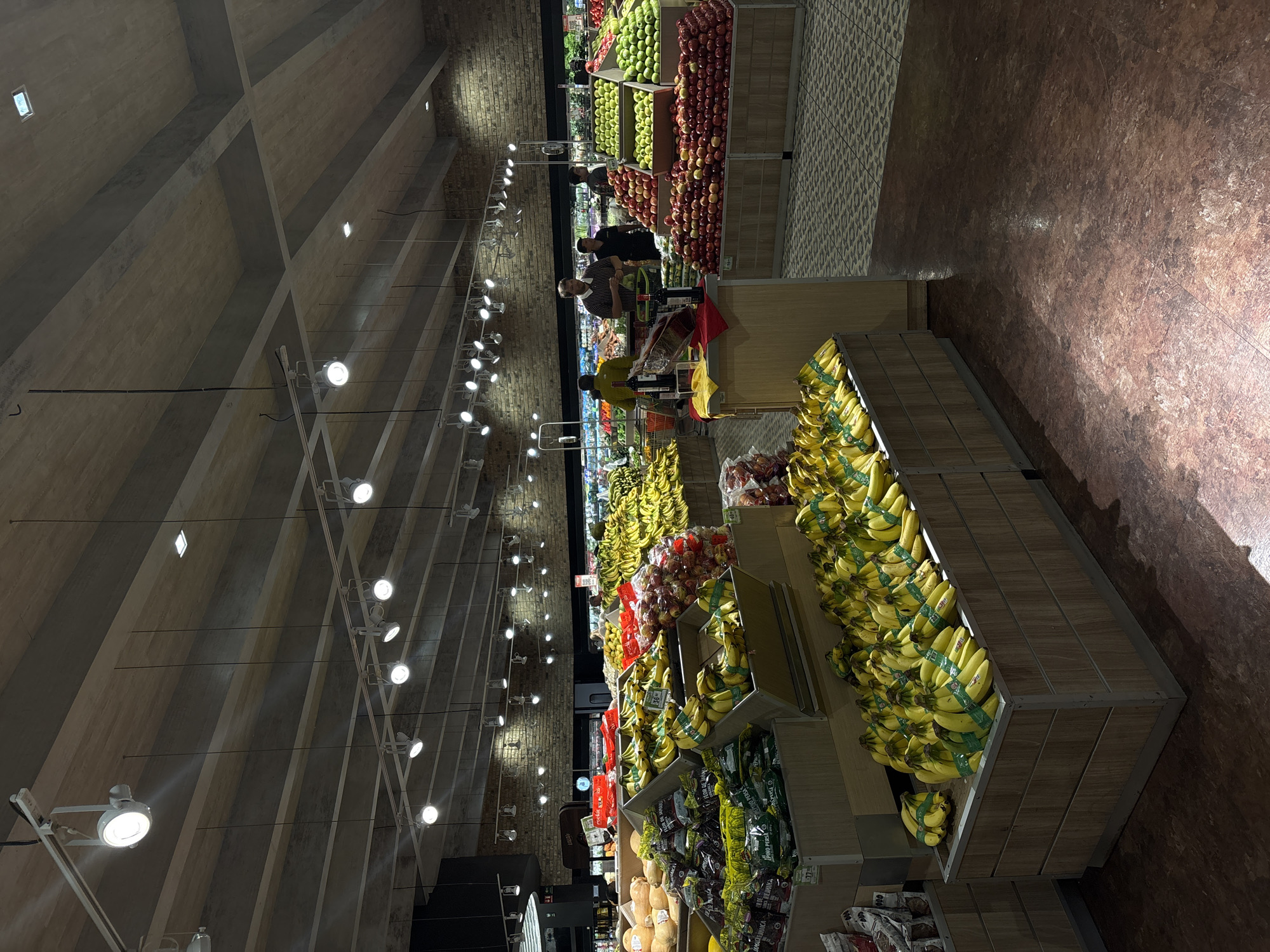 interior of a grocery store in Heroica Puebla de Zaragoza, Mexico. Rows of produce are displayed on wooden shelving units. Bananas are prominently featured in the foreground. In the background, shoppers are visible near displays of apples and other fruits. The store has a high ceiling with exposed concrete beams and rows of lights. The floor is a mix of brown and patterned tiles.